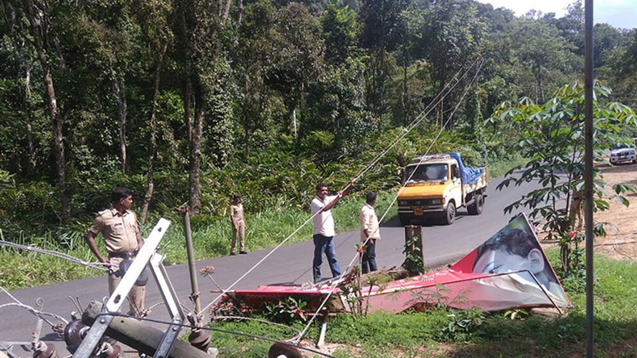 ഇടുക്കി: നെടുങ്കണ്ടം മൈലാടുംപാറയ്ക്ക് സമീപത്തായി ഏലതോട്ടത്തില് നിന്ന വന് മരമാണ് ഇന്ന് ഉച്ചതിരിഞ്ഞ് റോഡിലേയ്ക്ക് കടപുഴകി വീണത്. മുഖ്യമന്ത്രി കടന്നു പോകുന്നതിന് മണിക്കൂറുകള് മുമ്പാണ് മരം കടപുഴകിയത്. മരം വൈദ്യുതി ലൈനിലേയ്ക്കാണ് മറിഞ്ഞത്. മരം വീണതിന്റെ ആഘാതത്തില് പോസ്റ്റുകള് ഒടിഞ്ഞ് വീണു. നാല് പോസ്റ്റുകള് ഒടിയുകയും വൈദ്യുതി കമ്പികള് ഉപയോഗ ശൂന്യമാവുകയും ചെയ്തു.