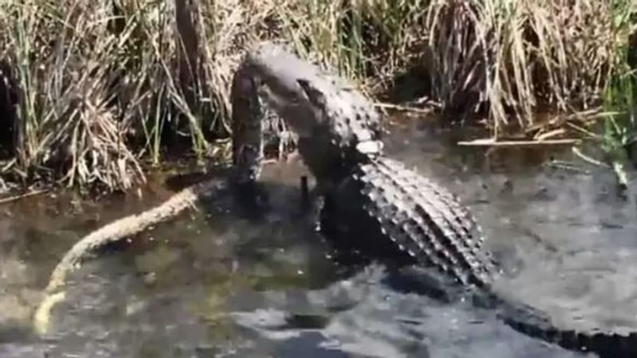 ഫ്ലോറിഡ: പാമ്പും കീരിയും തമ്മിൽ അടിയുണ്ടാക്കുന്നത് ഭൂരിഭാഗം പേരും കണ്ടിട്ടുണ്ടാകും. എന്നാൽ പെരുംമ്പാമ്പും മുതലയും തമ്മിൽ അടിയുണ്ടാക്കിയാൽ ആരായിരിക്കും വിജയിക്കുക. അത്തരത്തിൽ പരസ്പരം അക്രമിക്കുന്ന പെരുമ്പാമ്പിന്റെയും മുതലയുടെയും വീഡിയോ ആണ് ഇപ്പോൾ സമൂഹമാധ്യമങ്ങളിൽ വ്യാപകമായി പ്രചരിക്കുന്നത്.