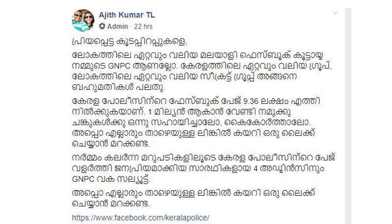 2.3 മില്യണ് അംഗങ്ങളുള്ള ഗ്രൂപ്പിന്റെ അഡ്മിന് തന്നെയാണ് ഇങ്ങനെ ഒരു അഭ്യര്ഥനയുമായി എത്തിയിരിക്കുന്നത്. 9.36 ലക്ഷം ലെെക്കുകളാണ് ഇപ്പോള് കേരള പൊലീസിന്റെ ഔദ്യോഗിക ഫേസ്ബുക്ക് പേജിനുള്ളത്. ഇത് പത്ത് ലക്ഷമാക്കാന് ജിഎന്പിസിയിലെ അംഗങ്ങളോട് സഹായിക്കാന് ആവശ്യപ്പെട്ടിരിക്കുകയാണ് അഡ്മിന് അജിത് കുമാര് ടി എല്.