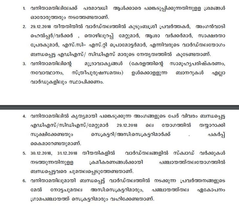 വനിതാ മതിലിന്റെ മുദ്രാവാക്യങ്ങള് ഉള്ക്കൊള്ളുന്ന ബാനറുകള് എല്ലാ വാര്ഡുകളിലും സ്ഥാപിക്കണം. വനിതാ മതിലിന്റെ വാര്ഡ് തല പ്രവര്ത്തനങ്ങളുടെ ചുമതല അസിസ്റ്റന്റ് സെക്രട്ടറിമാര്ക്കും പഞ്ചായത്ത് തല ഏകോപനം പഞ്ചായത്ത് സെക്രട്ടറിമാര്ക്കും ആയിരിക്കുമെന്നും ഉത്തരവ് വ്യക്തമാക്കുന്നു.