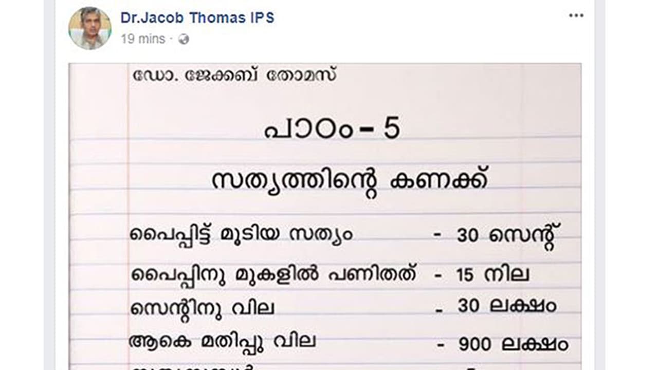 സത്യത്തിന്റെ മുഖം സ്വീവേജ് പൈപ്പുപോലെ എന്നാണ് ജേക്കബ് തോമസ് കുറിച്ചിരിക്കുന്നത്.