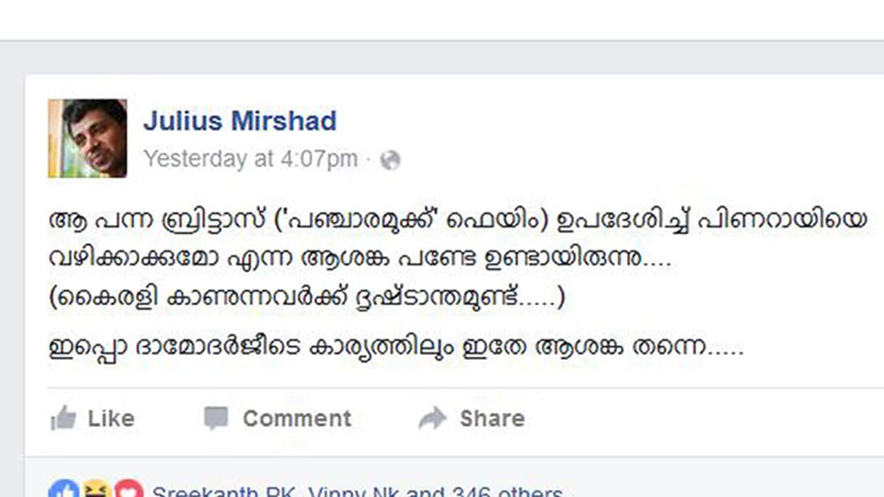 തിരുവനന്തപുരം: ജോണ് ബ്രിട്ടാസിനെതിരേയും അഡ്വ. എം.കെ. ദാമോദരനെതിരേയും അതിരൂക്ഷ വിമര്ശനവുമായി സിപിഎം കോഴിക്കോട് ജില്ലാ സെക്രട്ടറി പി. മോഹനന്റേയും മുന് എംഎല്എ കെ.കെ. ലതികയുടേയും മകന് ജൂലിയസ് ഇര്ഷാദ് രംഗത്ത്. 'പന്ന' ബ്രിട്ടാസ് പിണറായിയെ ഉപദേശിച്ചു വഴിക്കാക്കുമോയെന്ന ആശങ്ക തനിക്കു പണ്ടേ ഉണ്ടായിരുന്നുവെന്നും ഇപ്പോള് എം.കെ. ദാമോദരന്റെ കാര്യത്തിലും ഇതേ ആശങ്കയാണെന്നും ജൂലിയസ് മിര്ഷാദ് ഫേസ്ബുക്കില് കുറിച്ചു.
