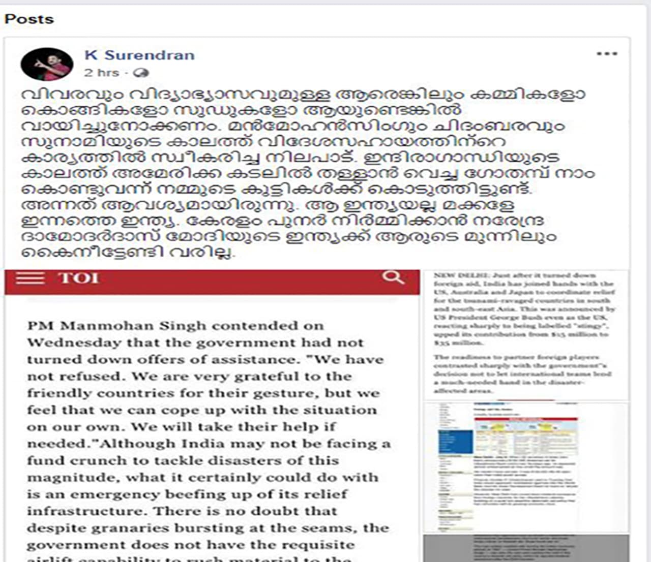 വിവരവും വിദ്യാഭ്യാസവുമുള്ള ആരെങ്കിലും കമ്മികളോ കൊങ്ങികളോ സുഡുകളോ ആയുണ്ടെങ്കിൽ വായിച്ചുനോക്കണം. മൻമോഹൻസിംഗും ചിദംബരവും സുനാമിയുടെ കാലത്ത് വിദേശസഹായത്തിന്റെ കാര്യത്തിൽ സ്വീകരിച്ച നിലപാട്. ഇന്ദിരാഗാന്ധിയുടെ കാലത്ത് അമേരിക്ക കടലിൽ തള്ളാൻ വെച്ച ഗോതമ്പ് നാം കൊണ്ടുവന്ന് നമ്മുടെ കുട്ടികൾക്ക് കൊടുത്തിട്ടുണ്ട്. അന്നത് ആവശ്യമായിരുന്നു. ആ ഇന്ത്യയല്ല മക്കളേ ഇന്നത്തെ ഇന്ത്യ. കേരളം പുനർ നിർമ്മിക്കാൻ നരേന്ദ്ര ദാമോദർദാസ് മോദിയുടെ ഇന്ത്യക്ക് ആരുടെ മുന്നിലും കൈനീട്ടേണ്ടി വരില്ല.