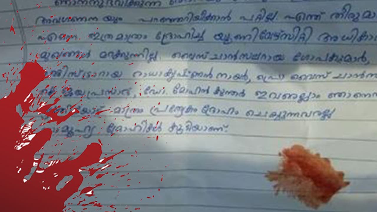 കൈഞരമ്പ് മുറിച്ചാണ് വിദ്യാർത്ഥി ആത്മഹത്യക്ക് ശ്രമിച്ചത്. മറ്റു വിദ്യാർത്ഥികൾ ചേർന്ന് ആശുപത്രിയിലെത്തിക്കുകയായിരുന്നു. ആത്മഹത്യാ കുറിപ്പ് നേരത്തെ പുറത്തുവന്നിരുന്നു. താൻ അനുഭവിച്ച വേദനയും ക്രൂരതയും അവഗണനയും പറഞ്ഞറിയിക്കാൻ പറ്റില്ലെന്നും വൈസ് ചാൻസിലറും പ്രൊവൈസ് ചാൻസിലറും രജിസ്ട്രാറും സർവ്വകലാശാല അധ്യാപകൻ മോഹൻ കുന്തറും സാമൂഹ്യ ദ്രോഹികളാണെന്നും കുറിപ്പിലുണ്ട്
