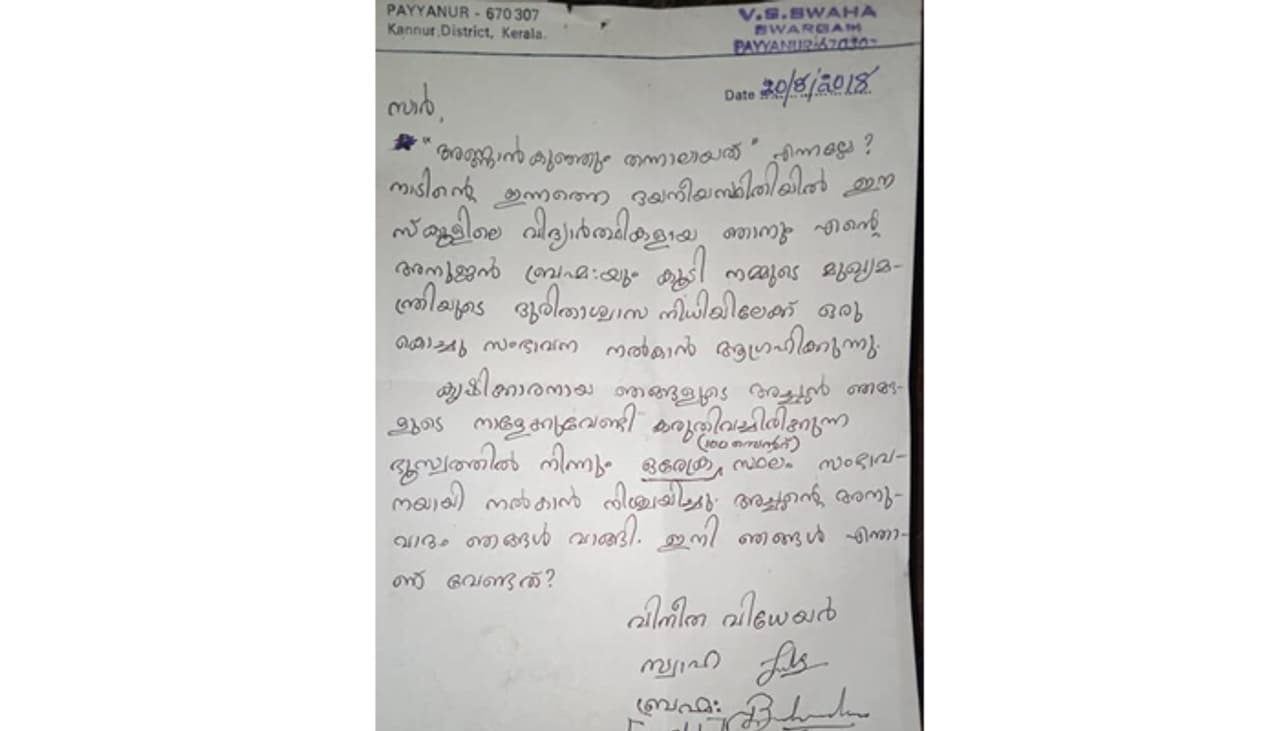 "അണ്ണാന് കുഞ്ഞും തന്നാലായത്" എന്നല്ലേ? നാടിന്റെ ഇന്നത്തെ ദയനീയസ്ഥിതിയില് ഈ സ്കൂളിലെ വിദ്യാര്ത്ഥികളായ ഞാനും എന്റെ അനുജന് ബ്രഹ്മയും കൂടി നമ്മുടെ മുഖ്യമന്ത്രിയുടെ ദുരിതാശ്വാസ നിധിയിലേക്ക് ഒരു കൊച്ച് സംഭാവന നല്കാന് ആഗ്രഹിക്കുന്നു.