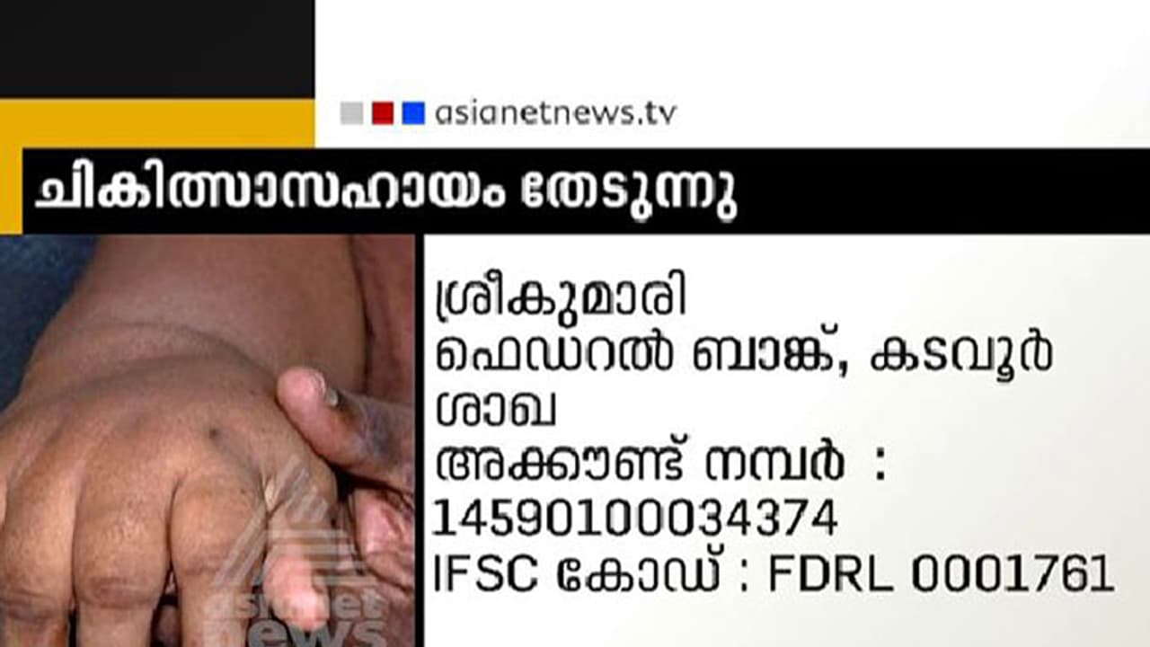 ശ്രീകുമാരിയെ പരിചരിക്കേണ്ടതിനാല് ഇദ്ദേഹത്തിന് മറ്റ് ജോലിക്ക് പോകാന് ആകുന്നില്ല. പണമില്ലാത്തതിനാല് കഴിഞ്ഞ മാസം എടുക്കേണ്ട രണ്ട് കുത്തിവെയ്പ്പ് എടുത്തില്ല. നാട്ടുകാരാണ് ദിവസവും ഇവര്ക്ക് ഭക്ഷണമെത്തിക്കുന്നത്. ശ്രീകപമാരിയമ്മയുടെ തുടര് ചികത്സയ്ക്ക് സുമനസുകളുടെ സഹായം പ്രതീക്ഷിച്ചിരിക്കുകയാണ് സുദര്ശനന്. ശ്രീകുമാരിയമ്മയുടെ പേരില് ഫെഡറല് ബാങ്കില് ആരംഭിച്ച അക്കൗണ്ട് ഡീറ്റയില്സ്.