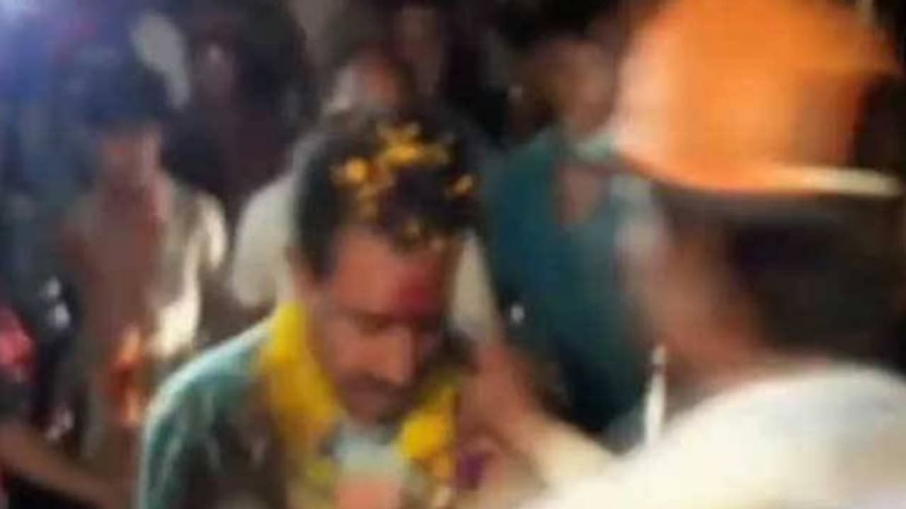 കാവി നിറത്തിലുള്ള തൊപ്പിധരിച്ച യുവാവാണ് ജനങ്ങളുടെ ഇടയില് നിന്നും പെട്ടെന്ന് എഴുന്നേറ്റ് എം.എല്.എയുടെ കഴുത്തില് ചെരുപ്പുമാല ഇട്ടത്