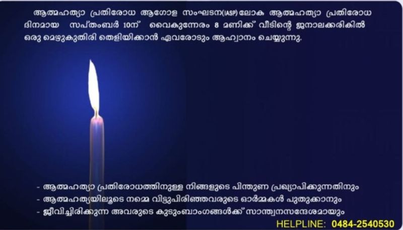 ലോക ആത്മഹത്യാ പ്രതിരോധ ദിനത്തിന്റെ സന്ദേശം ജനങ്ങളിലെത്തിക്കാൻ മൈത്രി സംഘടന. ആത്മഹത്യാ പ്രതിരോധ ദിനമായ നാളെ ആത്മഹത്യയ്ക്ക് എതിരെ 'ജീവന്റെ വെളിച്ചം പകരാം ഒരു മെഴുകു തിരി വെട്ടം' എന്ന പരിപാടി സംഘടിപ്പിക്കാൻ ഒരുങ്ങുകയാണ് മൈത്രി. 24 വർഷമായി കൊച്ചിയിൽ പ്രവർത്തിക്കുന്ന ആത്മഹത്യാ പ്രതിരോധ സംഘടനയാണ് മൈത്രി. ആത്മഹത്യാ പ്രതിരോധ സന്ദേശം സമൂഹത്തിന് നൽകുകയെന്നതാണ് സംഘടന ഈ പരിപാടി വഴി ലക്ഷ്യമിടുന്നത്. വീടിന്റെ ജനലരികിൽ ഒരു മെഴുകു തിരി കൊളുത്തി ആത്മഹത്യാ പ്രതിരോധ സന്ദേശം സമൂഹത്തിനു പകരുവാൻ പൊതു ജനങ്ങളോട് അഭ്യർഥിക്കുകയാണ് മൈത്രി.