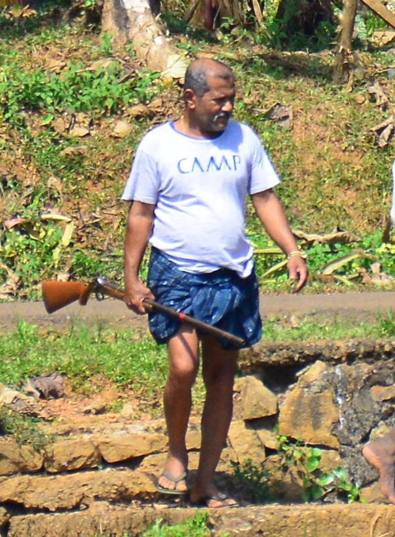 അടുത്ത ഫോട്ടോയിലും അതേ ആള് തന്നെയാണ്. പക്ഷേ, പാടത്തല്ല നില്പ്പ്. ഫോറസ്റ്റ് സ്റ്റേഷനിലാണ്. രണ്ട് കയ്യിലും തോക്കുണ്ട്. മുന്നില്, വെടിവച്ച് വീഴ്ത്തിയ പക്ഷിയുടെ ഇറച്ചിയും. ആദ്യ ചിത്രത്തിലെ ഗ്ലാമര് ഒന്നും ഇതിലില്ല. തല കുനിഞ്ഞ് നില്പ്പാണ് കക്ഷി. അറസ്റ്റിലായുള്ള നില്പ്പാണ്. റിമാന്റിലായി ജയിലിലില് പോവുന്നതിനു മുമ്പുള്ള സ്ഥിതി!
