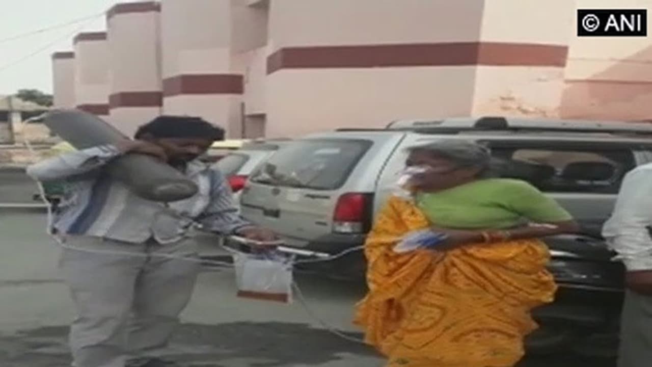 രോഗിയുടെ ഓക്‌സിജൻ സിലിണ്ടർ മകന്‍റെ തോളിൽ ചുമത്തി അധികൃതരുടെ ക്രൂരത ഉത്തർപ്രദേശിലെ ആഗ്ര മെഡിക്കൽ കോളേജ് ആശുപത്രിയിലാണ് സംഭവം