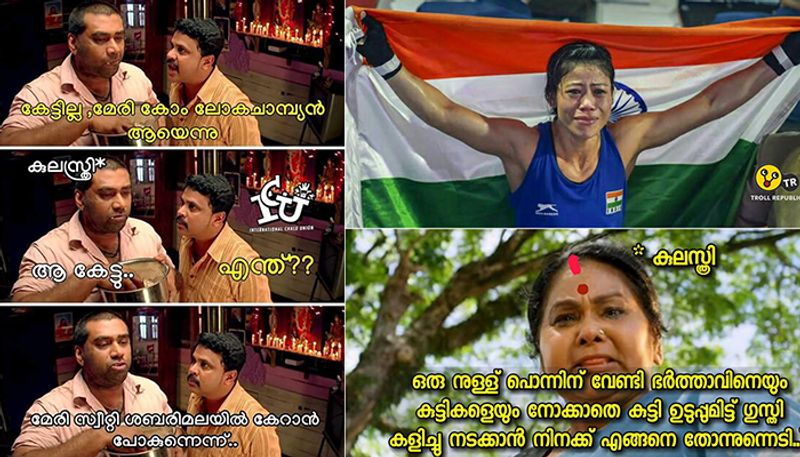 നല്ലതായാലും ചീത്തയായാലും ഒരു വാർത്തയെ സോഷ്യൽ മീഡിയ ഏറ്റെടുക്കുന്നത് ട്രോൾ രൂപത്തിലായിരിക്കും. വനിതാ ബോക്സിംഗ് താരം മേരി കോമിന്റെ ചരിത്ര നേട്ടമാണ് ഇപ്പോൾ ട്രോൾ ഗ്രൂപ്പുകളിലെമ്പാടും നിറയുന്നത്. ലോക ബോക്സിംഗ് ചാമ്പ്യൻ ഷിപ്പിൽ ആറാം സ്വർണ്ണ നേട്ടം കരസ്ഥമാക്കിയ മേരികോം ആണ് ഏറ്റവും പുതിയ വാർത്താ താരം. ശബരിമല സ്ത്രീ പ്രവേശന വിഷയവുമായി ബന്ധപ്പെടുത്തിയാണ് സോഷ്യൽ മീഡിയ ട്രോളുകൾ മേരി കോമിന്റെ നേട്ടത്തെ ആഘോഷമാക്കുന്നത്.