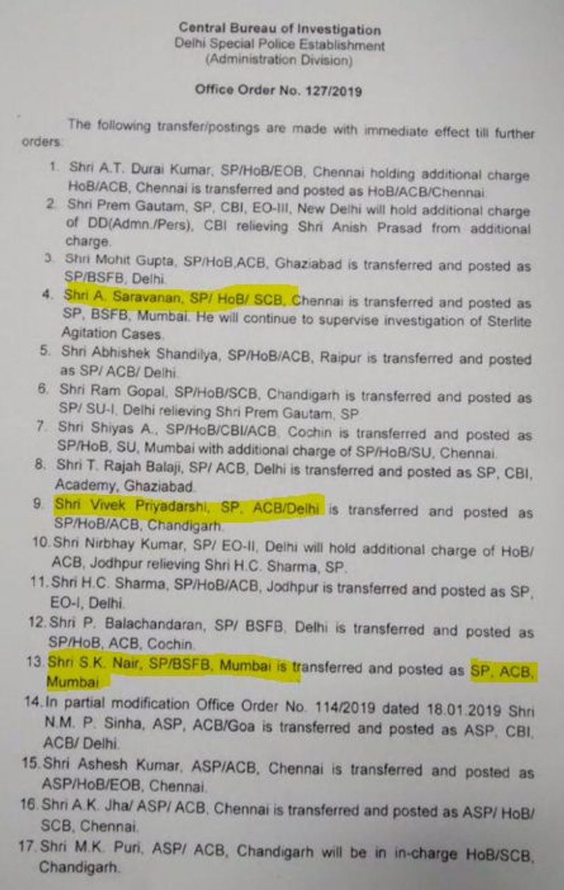 പുതിയ സിബിഐ ഡയറക്ടറെ തെരഞ്ഞെടുക്കാനുള്ള യോഗം വ്യാഴാഴ്ചയാണ്. അതിന് മുമ്പാണ് 20 ഉദ്യോഗസ്ഥരെ സ്ഥലം മാറ്റി ഇടക്കാല ഡയറക്ടർ എം നാഗേശ്വരറാവു ഉത്തരവിട്ടത്.
