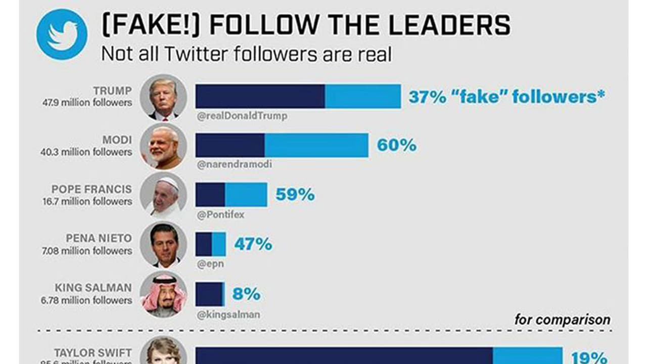 മാര്ച്ച് ആദ്യം നടത്തിയ കണക്കെടുപ്പില് മോദിയെ ട്വിറ്ററില് 4,03,00,000 പേര് പിന്തുടരുന്നതായാണ് കണക്ക്. അതില് അറുപത് ശതമാനവും വ്യാജന്മാരാണ്. മോദി കഴിഞ്ഞാല് ഏറ്റവും കൂടുതല് വ്യാജന്മാര് പിന്തുടരുന്നത് ഫ്രാന്സിസ് മാര്പ്പാപ്പയെയാണ്. മാര്പ്പാപ്പയെ പിന്തുടരുന്ന 59 ശതമാനം പേരുടേതും വ്യാജ അക്കൗണ്ടുകളാണ്. മെക്സിക്കന് പ്രസിഡന്റ് പെനാലിറ്റോയുടെ 47 ശതമാനം പിന്തുടര്ച്ചകാരും വ്യാജന്മാരാണ്. സൗദി ഭരണാധികാരി സല്മാന് രാജാവിന് പക്ഷേ 8 ശതമാനം വ്യാജന്മാരെ പിന്തുടരുന്നൊള്ളൂ.
