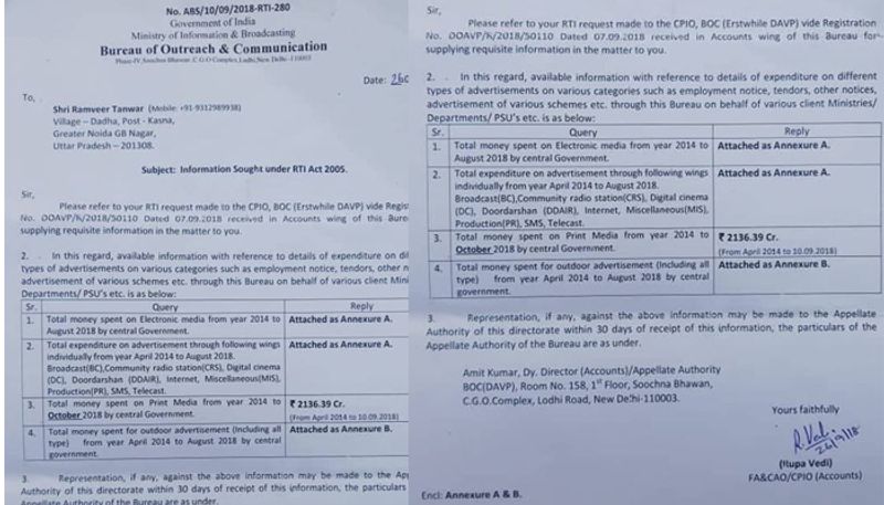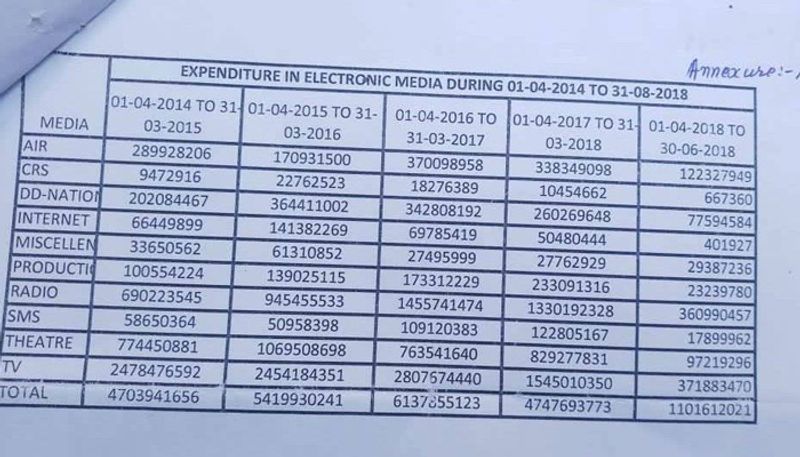 2014-15 കാലയളവില് പരസ്യത്തിനായി ചെലവിട്ടത് 81.27 കോടി രൂപയാണ്. 2017-18 കാലഘട്ടത്തില് ഇത് 208.54 കോടിയായി ഉയര്ന്നു. പത്ത് വര്ഷം നീണ്ട യുപിഎ ഭരണത്തില് പരസ്യത്തിനായി ചെലവിട്ട തുക 504 കോടി രൂപയാണ്. അതേസമയം എന്ഡിഎ സര്ക്കാര് ഓരോ വര്ഷവും 1202 കോടി രൂപയാണ് പരസ്യത്തിനായി ചെലവിട്ടിരിക്കുന്നത്.