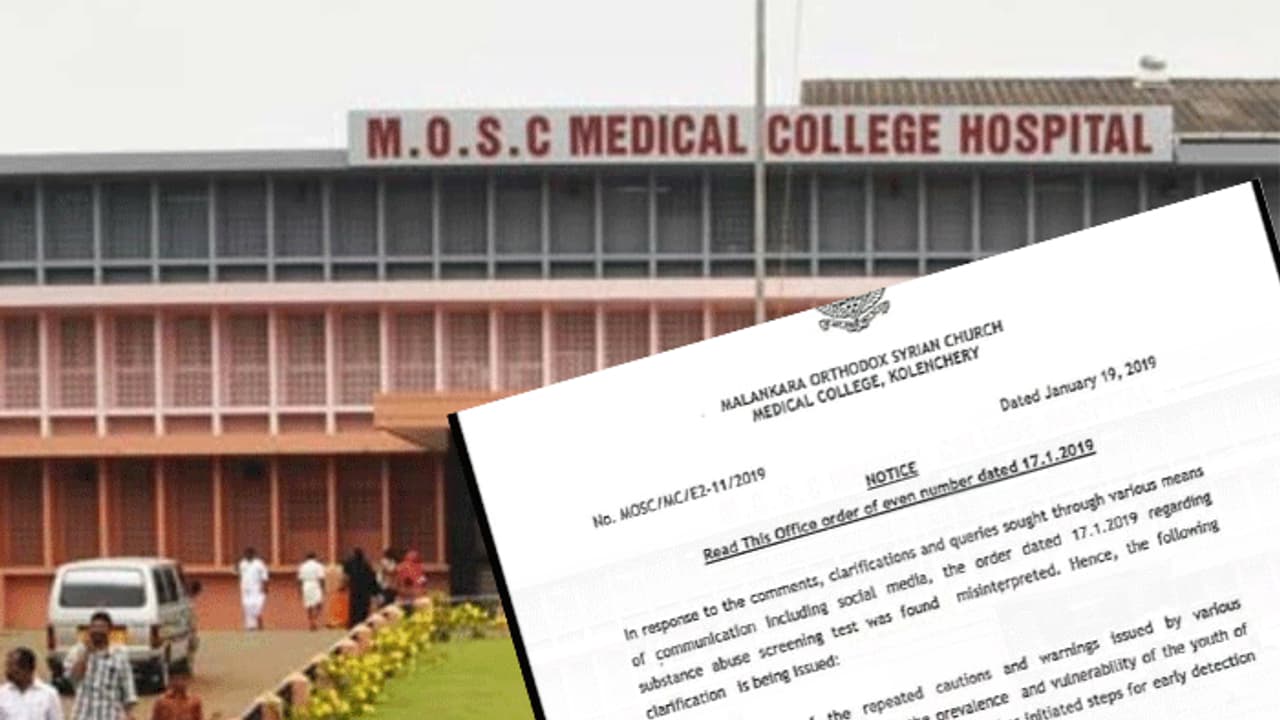 ഈ മാസം 17നാണ് കോലഞ്ചേരി മെഡിക്കൽ കോളേജ് ആദ്യ സർക്കുലർ പുറത്തിറക്കിയത്. കോളേജ് ഡീന് ഡ.: കെ.കെ ദിവാകറിന്റെ പേരിൽ പുറത്തിറക്കിയ സര്ക്കുലറിൽ ലഹരി ഉപയോഗിക്കുന്നവരെ കണ്ടെത്താന് നടപടികള് ആരംഭിച്ചതായി പറയുന്നു. ഇതിന് വേണ്ടി മൂത്രപരിശോധന നടത്തുന്നതിന് വിദ്യാർത്ഥികൾ സഹകരിക്കണമെന്നും സർക്കുലറിൽ ആവശ്യപ്പെടുന്നു. ഫോറന്സിക് മെഡിസിനിലെ അസി. പ്രൊഫസറെ പരിശോധന നടത്തുന്നതിന് ചുമതലപ്പെടുത്തിയിട്ടുണ്ടെന്നും സർക്കുലറിൽ പറയുന്നു.