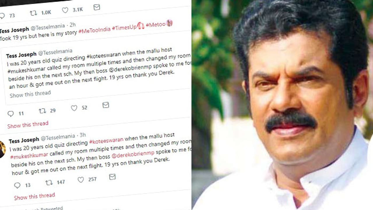 ഒരു ടെലിവിഷന് പരിപാടിയുടെ ചിത്രീകരണത്തിനിടയില് പത്തൊന്പത് വര്ഷം മുന്പ് നടന്ന സംഭവം ആണ് ടെസ് ജോസഫ് എന്ന യുവതി വെളിപ്പെടുത്തിയത്. അന്ന് ചിത്രീകരണത്തിനിടയില് മുകേഷ് നിരന്തരം വിളിച്ച് തന്റെ അടുത്ത മുറിയിലേക്ക് മാറാന് നിര്ബന്ധിച്ചെന്നാണ് പരിപാടിയുടെ സാങ്കേതിക പ്രവര്ത്തകയായിരുന്ന ടെസ് ജോസഫ് പറയുന്നത്. നിരന്തരം ഫോണ് വിളികള് വന്നതിനെ തുടര്ന്ന് അന്ന് തന്റെ മേധാവിയായ, ഇപ്പോള് തൃണമൂല് കോണ്ഗ്രസ് എംപിയായ ഡെറിക്ക് ഒബ്രിയാനോട് പറയുകയും അദ്ദേഹം അത് പരിഹരിക്കുകയും ചെയ്തു. അദ്ദേഹത്തിനോട് നന്ദിയുണ്ടെന്നും ടെസ് പറയുന്നു. അതേ സമയം ഡെറിക്ക് ഒബ്രയാന് സംഭവത്തില് പ്രതികരണമൊന്നും നടത്തിയില്ലെന്നാണ് റിപ്പോര്ട്ട്. ട്വിറ്ററിലൂടെയാണ് ടെസ് ജോസഫിന്റെ ആരോപണം.