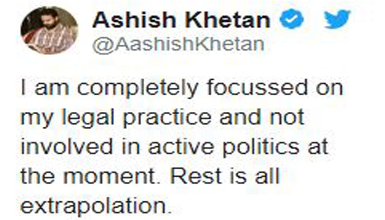 അശുതോഷിന്റെ രാജിക്ക് പിന്നാലെ ആം ആദ്മി നേതാവ് ആശിഷ് ഖേതനും. പാർട്ടി വിടുന്നുവെന്ന സൂചന നൽകി ആശിഷ്. നിയമപരിശീലനത്തിന് കൂടുതൽ ശ്രദ്ധ നൽകുമെന്ന് ആശിഷ് ട്വിറ്ററില് കുറിച്ചു.