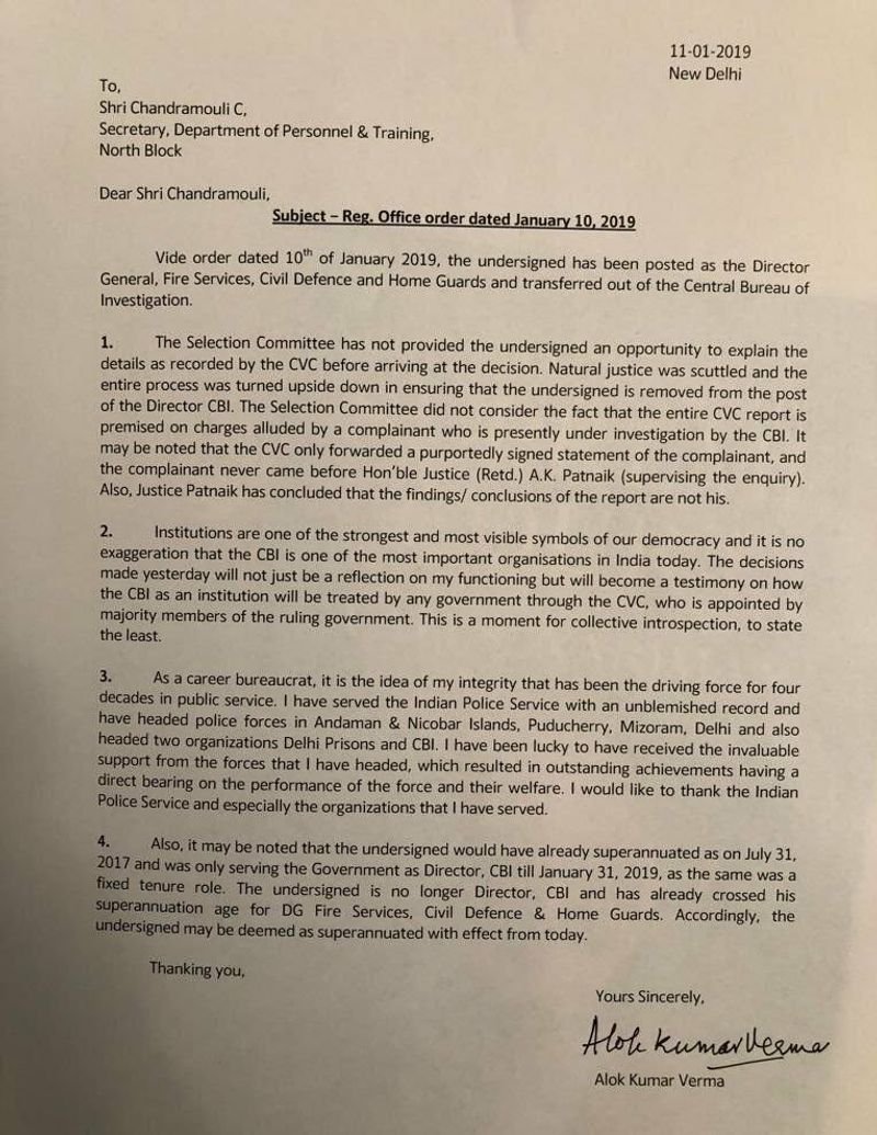 തന്റെ ഭാഗം വിശദീകരിക്കാനുള്ള അവസരം സെലക്ഷൻ കമ്മിറ്റി തന്നില്ലെന്ന് കത്തിൽ അലോക് വർമ പറയുന്നുണ്ട്. 'സ്വാഭാവികനീതി തനിക്ക് നിഷേധിക്കപ്പെട്ടു. എന്നെ പുറത്താക്കണമെന്ന് തന്നെ കണക്കൂകൂട്ടിക്കൊണ്ടുള്ള നീക്കങ്ങളാണ് നടന്നത്. സിബിഐയുടെ തന്നെ അന്വേഷണം നേരിടുന്ന ഒരാളുടെ ആരോപണങ്ങളുടെ അടിസ്ഥാനത്തിലാണ് സിവിസിയുടെ റിപ്പോർട്ട് എന്നത് സെലക്ഷൻ കമ്മിറ്റി പരിഗണിച്ചിട്ടുപോലുമില്ല. ജൂലൈ 31-ന് എന്റെ വിരമിക്കൽ പ്രായം പിന്നിട്ടതാണ്. സിബിഐ ഡയറക്ടർ പദവി തന്ന് എന്റെ കാലാവധി നീട്ടുക മാത്രമാണ് ചെയ്തത്. ഫയർ സർവീസസ് ഡിജി പദവി ഏറ്റെടുക്കാൻ എന്റെ പ്രായപരിധി തടസ്സമാണ്. അതിനാൽ എന്നെ സ്വയം വിരമിക്കാൻ അനുവദിക്കണം.'' വർമ കത്തിൽ കുറിച്ചു.
