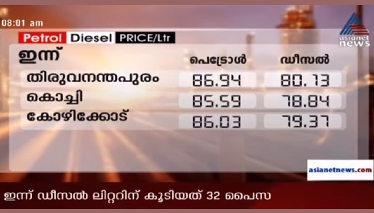 ഡീസലിന് ലിറ്ററിന് 32 പൈസയും പെട്രോള് ലിറ്ററിന് 25 പൈസയുമാണ് കൂടിയത്.