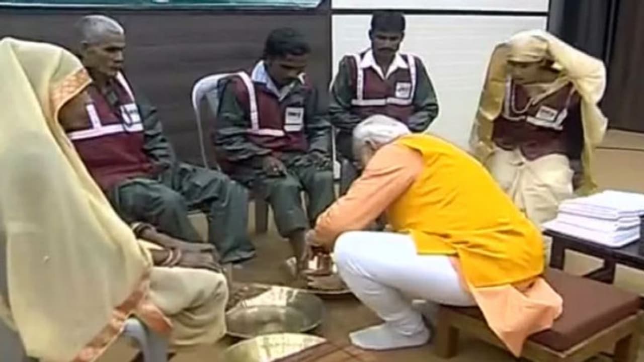 ഉത്തർപ്രദേശിലെ പ്രയാഗ്രാജിലെ കുംഭമേള സന്ദർശിക്കുന്നതിനിടയിലാണ് നഗരം വൃത്തിയായി സൂക്ഷിക്കുന്ന ശുചീകരണ തൊഴിലാളികളെ മോദി ആദരിച്ചത്. അഞ്ചോളം തൊഴിലാളികളുടെ കാലുകളാണ് മോദി കഴുകിയത്.