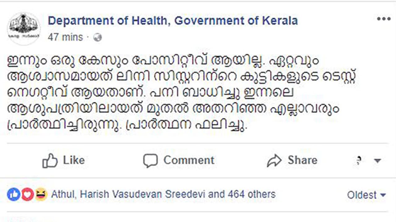 കുട്ടികളുടെ ടെസ്റ്റ് റിസല്റ്റ് നെഗറ്റീവാണ്. കുട്ടികള്ക്ക് പനി ബാധിച്ച് ഇന്നലെ ആശുപത്രിയിലായത് മുതല് അതറിഞ്ഞ എല്ലാവരും പ്രാര്ത്ഥിച്ചിരുന്നു. പ്രാര്ത്ഥന ഫലിച്ചു. ആരോഗ്യവകുപ്പിന്റെ ഫേസ്ബുക്ക് പോസ്റ്റില് കുറിച്ചിരിക്കുന്നു. നിപാ വൈറസ് ബാധയുള്ള ഒരു കേസും പുതുതായി രേഖപ്പെടുത്തിയിട്ടില്ലെന്നും ആരോഗ്യവകുപ്പിന്റെ ഫേസ് ബുക്ക് പോസ്റ്റില് പറയുന്നു.