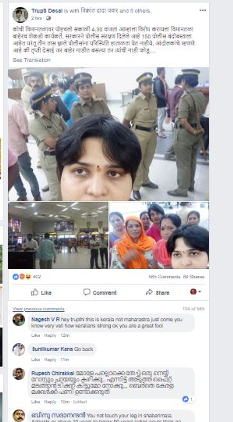 കൊച്ചി വിമാനത്താവളത്തില് എത്തിയതായി അറിയിച്ചുള്ള തൃപ്തിയുടെ പോസ്റ്റിന്റെ താഴെ ഗോ ബാക്ക് മുദ്രാവാക്യങ്ങളാണ് ശബരിമലയില് യുവതീപ്രവേശനമാകാമെന്ന സുപ്രീംകോടതി വിധിയെ എതിര്ക്കുന്നവര് മുഴക്കുന്നത്. ഇതിനിടെയിലും എന്ത് സംഭവിച്ചാലും ശബരിമലയില് പോകുമെന്നാണ് തൃപ്തി ദേശായി തീരുമാനം അറിയിച്ചിരിക്കുന്നത്.