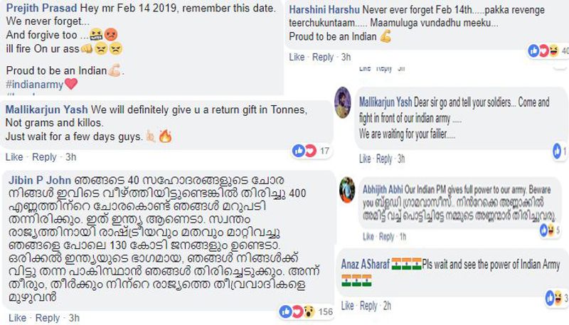 മലയാളികള് അടക്കം നിരവധി പേരാണ് കമന്റുകള് ഇടുന്നത്. പ്രധാനമായായും പുല്വാമയിലേറ്റ് അടിക്ക് തിരിച്ചടി നല്കുമെന്നുള്ള മുന്നറിയിപ്പുകളാണ് കമന്റുകള്. ഈ വേദന ഒരിക്കലും മറക്കില്ലെന്നും കുറിപ്പുകള് വരുന്നുണ്ട്