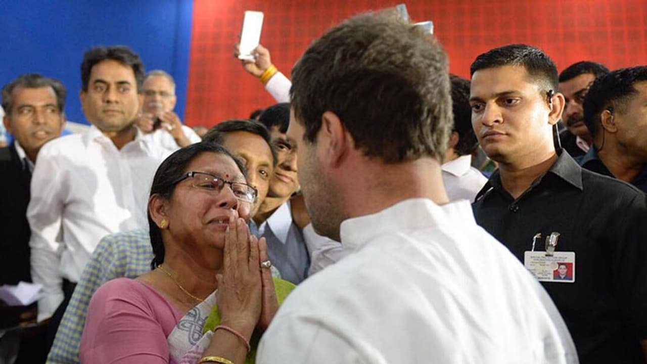 സദസിന്റെ മധ്യനിരയില് നില്ക്കുകയായിരുന്ന രഞ്ജനയ്ക്ക് അരികിലെത്തിയ രാഹുല് അവര്ക്കടുത്ത് കസേര വലിച്ചിട്ട് ഇരിക്കുകയും കൂടുതല് കാര്യങ്ങള് ചോദിച്ചറിയുകയും അവരെ ആശ്വസിപ്പിക്കുകയും ചെയ്തു. അവരെ ആലിംഗനം ചെയ്ത് പ്രതീക്ഷ കൈവിടാതെയിരിക്കാന് ഉപദേശിച്ച ശേഷം രാഹുല് വേദിയില് മടങ്ങിയിലെത്തി.