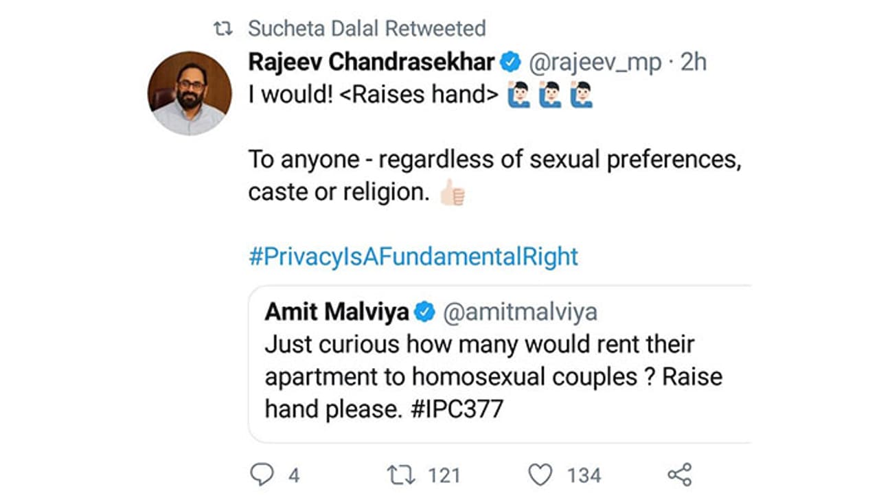 സ്വവർഗലൈംഗികതയിലെ നിയമവിലക്ക് ഒഴിവാക്കുന്നതിനെ എതിർക്കുന്ന നിലപാടാണ് ഹൈക്കോടതിയിൽ കോൺഗ്രസ് പാർട്ടി സ്വീകരിച്ചത്. എന്നാല് നരേന്ദ്രമോദി സർക്കാർ ഈ വിഷയത്തെ സുപ്രീം കോടതിയുടെ പരിഗണനയിൽ കൊണ്ടുവരികയും എൽജിബിറ്റി കമ്യൂണിറ്റിയുടെ അവകാശങ്ങൾക്കൊപ്പം നിലകൊണ്ട് ചരിത്രത്തിന്റെ ഭാഗമായിത്തീരുകയും ചെയ്തു. എന്നും രാജീവ് ചന്ദ്രശേഖരന് ട്വീറ്റ് ചെയ്തു.