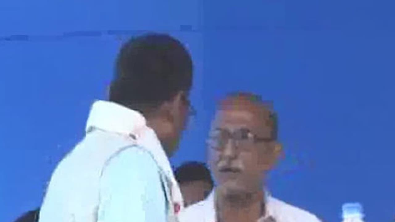 പരിപാടിയില് ഏതാനും ഉദ്ദ്യോഗസ്ഥര് സംസാരിച്ചതിന് ശേഷമായിരുന്നു വിരമിച്ച അധ്യാപകന്റെ അവസരം. സംസാരിക്കുന്നിതിനിടെ അദ്ദേഹം റോഡുകളുടെ മോശം സ്ഥിതിയെപ്പറ്റി വിവരിച്ചു. നിരവധി ഉദ്ദ്യോഗസ്ഥരെ റോഡ് നന്നാക്കണമെന്ന് ആവശ്യപ്പെട്ട് സമീപിച്ചു. ഒരു ഫലവുമുണ്ടായില്ല. എം.എല്.എയും ഒന്നും ചെയ്തില്ല. ബിബി റോഡിന്റെ സബ് വേ നന്നാക്കാന് പുതിയ സര്ക്കാറും എം.എല്.എയും എന്തെങ്കിലും ചെയ്യുമെന്നാണ് പ്രതീക്ഷയെന്നും അദ്ദേഹം പറഞ്ഞു. ഇതോടെ കുപിതനായ കേന്ദ്ര മന്ത്രി ഇരിപ്പിടത്തില് നിന്ന് എഴുനേറ്റ് പോയി മൈക്ക് പിടിച്ചുവാങ്ങുകയായിരുന്നു.