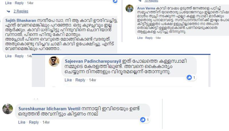 ഹിന്ദു സന്യാസിയുടെ മുഖംമൂടി അണിഞ്ഞ് ഹിന്ദുത്വത്തെ ഇല്ലായ്മ ചെയ്യാൻ ശ്രമിക്കുകയാണ് സ്വാമി അഗ്നിവേശ് എന്നാണ് സുരേഷ് കൃഷ്ണ തന്റെ പോസ്റ്റിൽ പറഞ്ഞിരിക്കുന്നത്. അരുദ്ധതി റോയിക്കെതിരെയും ദയാ ബായിക്കെതിരെയും ഇയാൾ തന്റെ പോസ്റ്റിലൂടെ വ്യക്തിഹത്യ നടത്തുന്നു. മതംമാറ്റ ഫ്രോഡ് എന്നാണ് ഇയാൾ ദയാബായിയെ വിശേഷിപ്പിച്ചിരിക്കുന്നത്. ഈ പോസ്റ്റിന് താഴെ വന്ന കമന്റിലാണ് സന്ദീപാനന്ദ ഗിരിയെയും ഇതുപോലെ കൈകാര്യം ചെയ്യണമെന്ന് ആഹ്വാനം ചെയ്തിരിക്കുന്നത്.