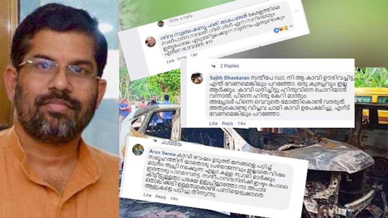 സ്വാമി അഗ്നിവേശിനെ ബിജെപി - യുവമോർച്ച പ്രവർത്തകർ ക്രൂരമായി മര്ദ്ദിച്ചത് കഴിഞ്ഞ ജൂലൈ മാസത്തിലാണ്. അഗ്നിവേശിനെ മര്ദ്ദിച്ച വാര്ത്ത ഷെയര് ചെയ്ത് കേരളത്തിലെ സംഘപരിവാര് അനുകൂലികള് സന്ദീപാനന്ദഗിരിക്കും രണ്ടെണ്ണം കിട്ടണമെന്നും ആക്രമിക്കണമെന്നും ഭീഷണി ഉയര്ത്തിയിരുന്നു. സ്വാമി അഗ്നിവേശ് വ്യാജ സ്വാമിയും ജിഹാദി മാവോയിസ്റ്റ് കൂട്ടുകെട്ടിന്റെ ഏജന്റുമാണെന്നാണ് സുരേഷ് കൃഷ്ണ ചേർപ്പുളശ്ശേരി എന്ന വ്യക്തിയുടെ പോസ്റ്റിൽ അക്രമത്തിനെ പിന്തുണച്ച് കൊണ്ട് കുറിച്ചിരിക്കുന്നത്.