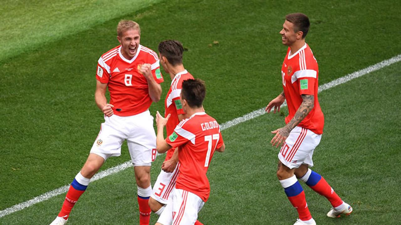 12ാം മിനിറ്റില്‍ യൂറി ഗാസിന്‍സ്‌കി, 43ാം മിനിറ്റില്‍ ഡെനിസ് ചെറിഷേവ് എന്നിവരാണ് റഷ്യയുടെ ഗോളുകള്‍ നേടിയത്.