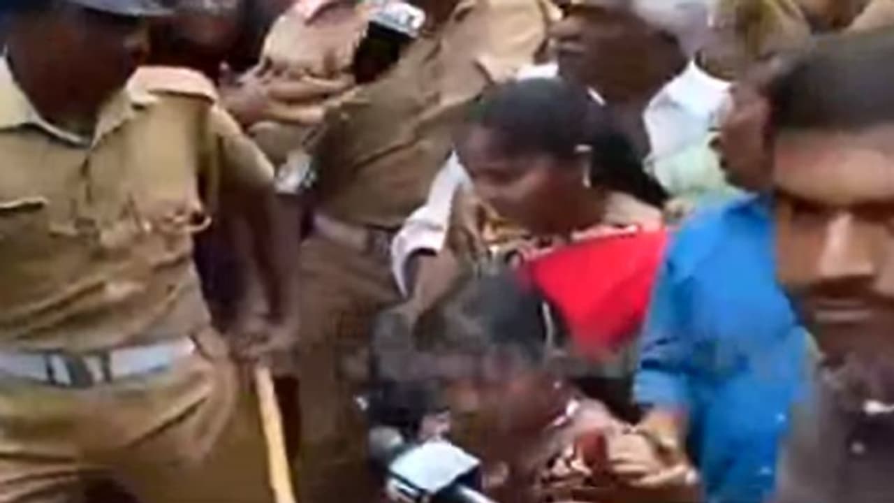 പതിനൊന്ന് മണിയോടെയാണ് ആന്ധ്രയിലെ ഈസ്റ്റ് ഗോദാവരി സ്വദേശിനി മാധവിയും കുടുംബവും പമ്പയിലെത്തിയത്. ആദ്യമായാണ് ഇവർ മല ചവിട്ടുന്നത്. സ്വാമി അയ്യപ്പൻ റോഡ് കടന്നെത്തിയ ഇവർക്ക് അതുവരെ പൊലീസ് സംരക്ഷണമുണ്ടായിരുന്നില്ല. ഗാർഡ് റൂം കടന്ന് മല കയറാനൊരുങ്ങിയ ഇവരെ 'സേവ് ശബരിമല' പ്രവർത്തകർ തടഞ്ഞു. ശരണം വിളിച്ചും ആക്രോശിച്ചും ചുറ്റും കൂടി. ഇതോടെ കുടുംബം പരിഭ്രാന്തിയിലായി. ഇവരുടെ പ്രായമാണ് പിന്നെ സമരക്കാർ ചോദിച്ചത്. അമ്പത് വയസ്സിന് താഴെയാണെന്ന് പറഞ്ഞതോടെ പോകാനനുവദിയ്ക്കില്ലെന്ന് പറഞ്ഞ് സമരക്കാർ ആക്രമണഭീഷണി മുഴക്കാൻ തുടങ്ങി. ചിലർ ഇവരെ കയ്യേറ്റം ചെയ്യാൻ മുതിർന്നു. തുടർന്നാണ് പൊലീസെത്തിയത്. കനത്ത സംരക്ഷണത്തിൽ ഇവരെ ഗണപതിക്ഷേത്രം വരെ എത്തിയ്ക്കാൻ പൊലീസ് ശ്രമിച്ചെങ്കിലും സമരക്കാർ മുന്നിൽ ഓടി. ഇവരെ തടയുമെന്ന് സമരക്കാർ വ്യക്തമാക്കിയതോടെ, പൊലീസ് പിൻവാങ്ങുകയായിരുന്നു.