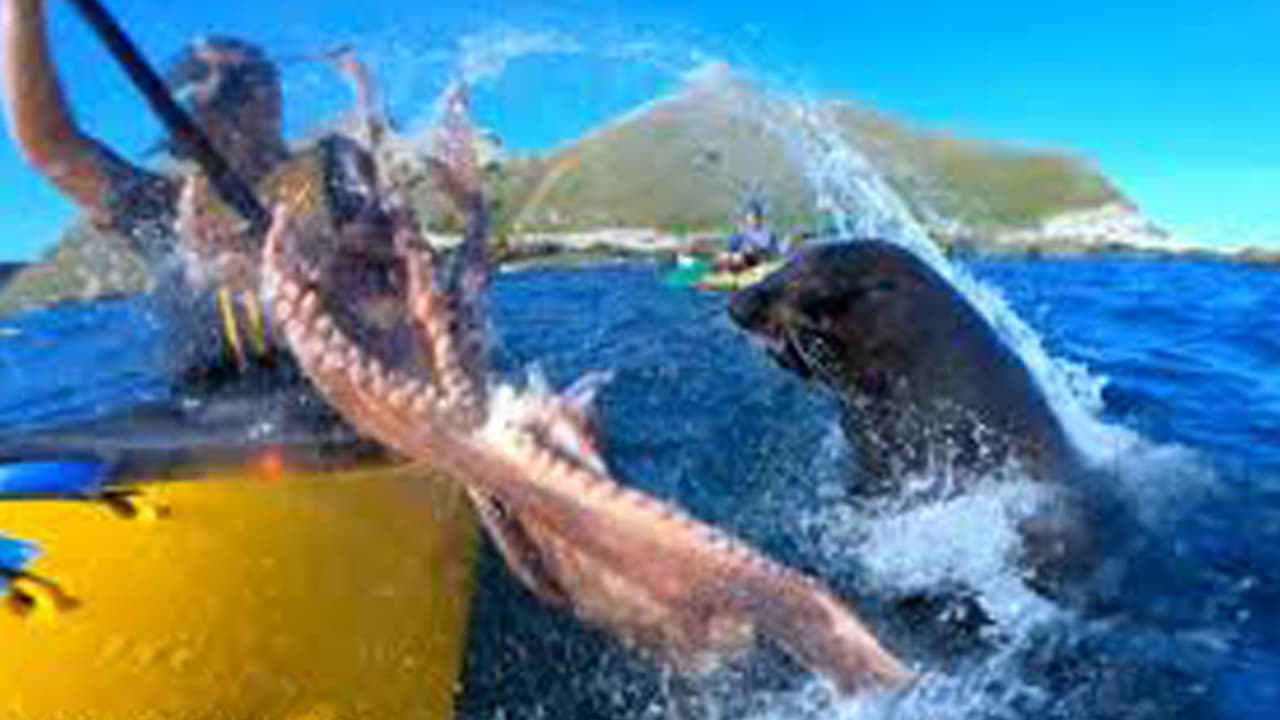 നീരാളിയെ മുഖത്തേക്ക് എടുത്തെറിഞ്ഞാണ് സീല് കയാക്കറെ ആക്രമിച്ചത്