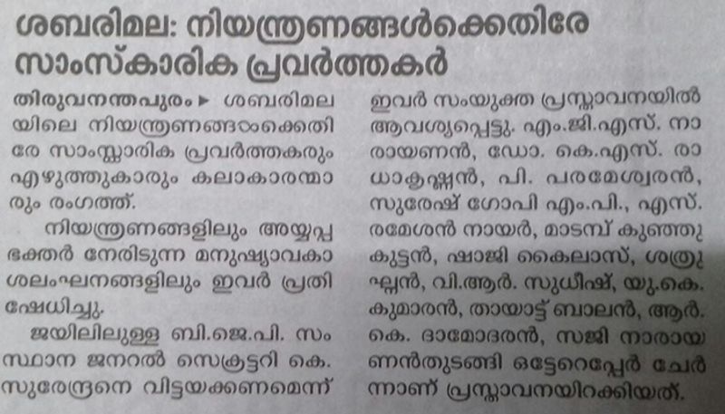 ശബരിമലയില് ഏര്പ്പെടുത്തിയ നിയന്ത്രണങ്ങളിലും അയ്യപ്പഭക്തര് നേരിടുന്ന മനുഷ്യാവകാശ ലംഘനങ്ങളിലും പ്രതിഷേധിക്കുന്നതായും. ജയിലിലുള്ള ബിജെപി നേതാവ് കെ.സുരേന്ദ്രനെ വിട്ടയക്കണമെന്നുമായിരുന്നു സംയുക്ത പ്രസ്താവനയില് ആവശ്യപ്പെട്ടിരുന്നത്.