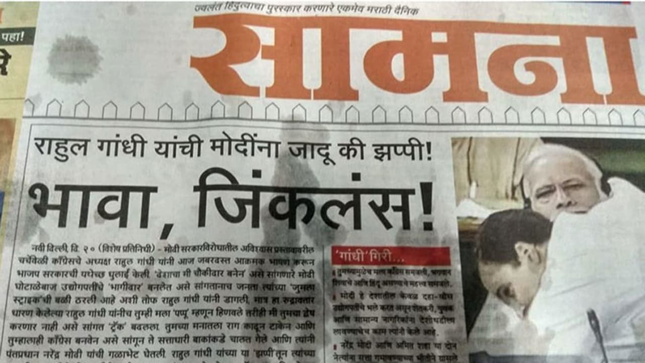 മുംബൈ: കോണ്ഗ്രസ് അധ്യക്ഷന് രാഹുൽ ഗാന്ധിയെ പ്രശംസിച്ച് ശിവസേനയുടെ മുഖപത്രം. രാഹുൽ വിജയിച്ചെന്ന തലകെട്ടോടെയാണ് ഇന്ന് ശിവസേനാ മുഖപത്രമായ സാംന പുറത്തിറങ്ങിയിരിക്കുന്നത്. ഇന്നലെ പാര്ലമെന്റില് നടന്ന പാർലമെന്റ് അവിശ്വാസ പ്രമേയത്തിന്റെ വാർത്തയുടെ തലക്കെട്ടിലാണ്രാഹുല് ഗാന്ധിക്ക് ശിവസേനയുടെ പ്രശംസ. പ്രധാനമന്ത്രി നരേന്ദ്ര മോദിയെ രാഹുല് ഗാന്ധി പാര്ലമെന്റില് വെച്ച് ആലിംഗനം ചെയ്യുന്ന ചെയ്യുന്ന ചിത്രവും നല്കിയിട്ടുണ്ട്. അവിശ്വാസ പ്രമേയത്തിന്മേലുള്ള ഇന്നലത്തെ സഭാ നടപടികള് ശിവസേന ബഹിഷ്കരിച്ചിരുന്നു.