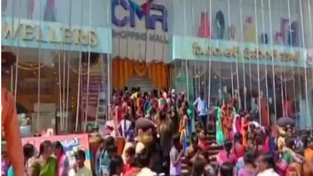 Telangana- Stampede at CMR showroom in Siddipet. The store had a special offer- a saree for rupees 10 only.! Crowd just barged in as the gates opened. Reportedly more than 15 people were injured and a woman also a gold chain, which was snatched from her neck. #Telanganapic.twitter.com/4x0gNFw0AE
