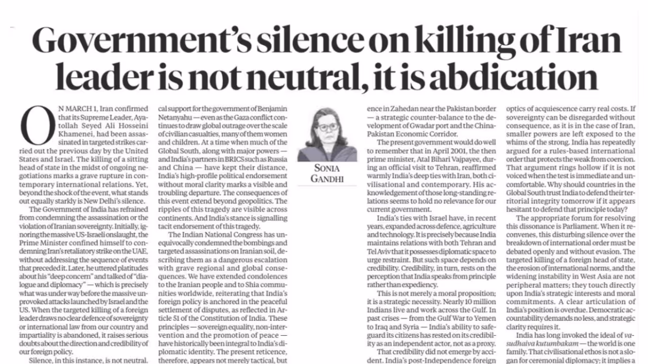 ദില്ലി: ഇറാന്റെ പരമോന്നത നേതാവ് ആയത്തുള്ള അയത്തൊള്ള അലി ഖമനേയിയെ വധിച്ചതിൽ ഇന്ത്യയുടെ നിശബ്ദത ചോദ്യം ചെയ്ത് സോണിയ ഗാന്ധി രംഗത്ത്. നിശബ്ദതയെ നിഷ്പക്ഷതയായി കാണാനാകില്ലെന്നും പരമാധികാര രാഷ്ട്രത്തിൻറെ നേതാവിനെ കൊലപ്പെടുത്തിയത് കടന്നുകയറ്റമായി കാണണമെന്നും സോണിയ പറഞ്ഞു. ഇന്ത്യയുടെ സ്വതന്ത്ര നിലപാടാണ് രാജ്യത്തിന് എന്നും വിശ്വാസ്യത നല്കിയത്. കോൺഗ്രസ് ഖമനേയിയുടെ വധത്തെ ശക്തമായി അപലപിക്കുന്നു. പാർലമെൻറിൽ സർക്കാർ ഇക്കാര്യത്തിലെ നിലപാട് വ്യക്തമാക്കണം. വാജ്പേയി ഇറാൻ സന്ദർശിച്ചതും സോണിയ ഗാന്ധി ഓർമ്മിപ്പിച്ചു.