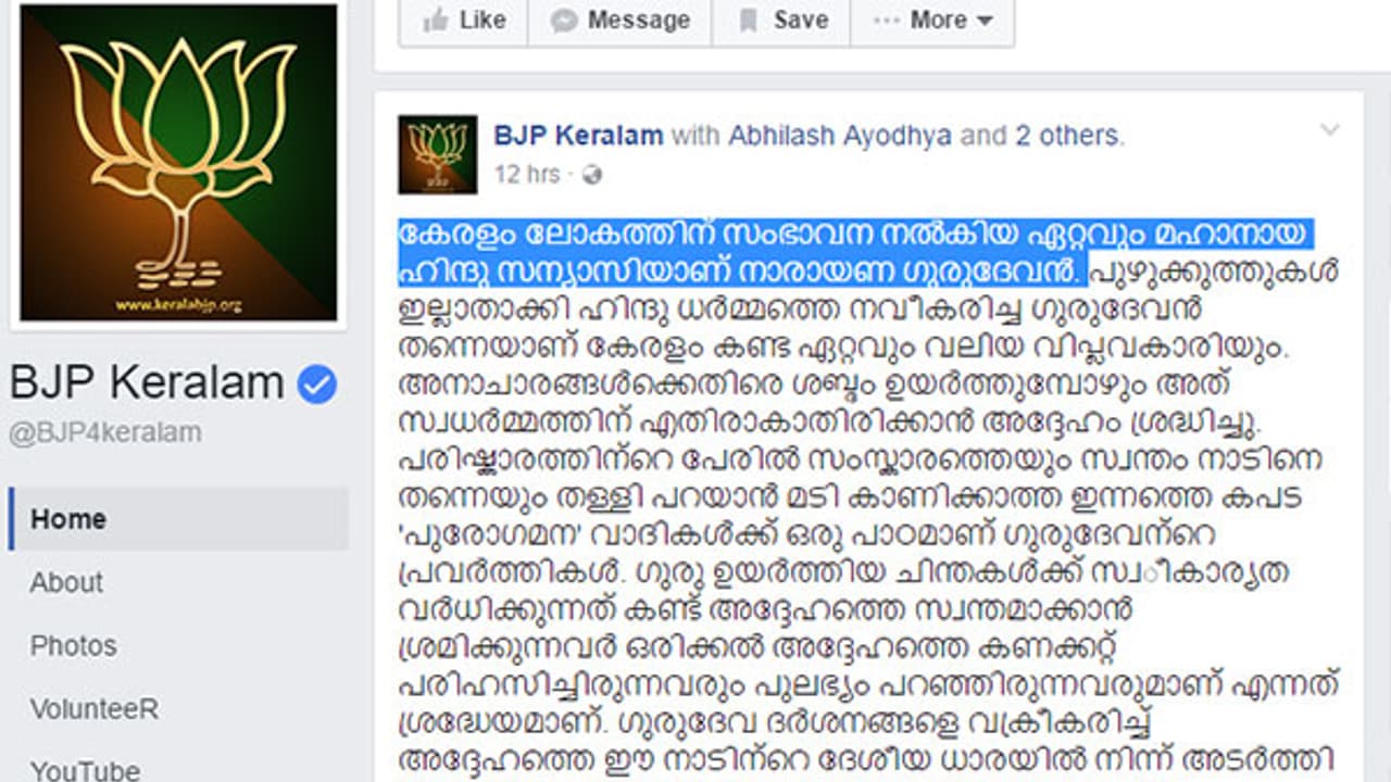 ജനസംഘത്തിന്റെ ദേശീയ സമ്മേളനം ആദ്യമായി കേരളത്തിൽ നടന്നപ്പോൾ കോഴിക്കോട്ടെ സമ്മേളന നഗരിക്ക് നൽകിയത് ഗുരുദേവന്റെ പേര് ആയിരുന്നു. ആ സമ്മേളനത്തിന്റെ അൻപതാം വർഷത്തിൽ മറ്റൊരു ദേശീയ കൗൺസിലിന് കൂടി കോഴിക്കോട് സാക്ഷ്യം വഹിക്കാൻ പോവുകയാണ്. സമ്മേളനം തുടങ്ങാൻ ദിവസങ്ങൾ മാത്രം ശേഷിക്കെ എത്തുന്ന ഗുരുദേവ ജയന്തി ആവേശ സ്മരണകളാണ് ഉയർത്തുന്നത്. ഏവർക്കും ചതയ ദിനാശംസകൾ.