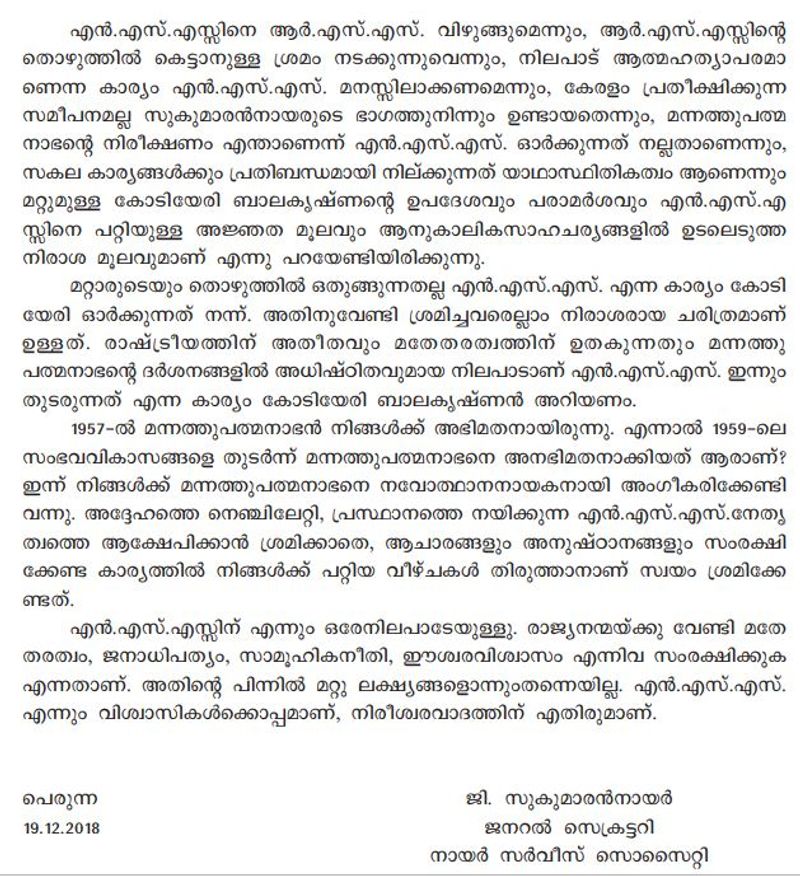 സുകുമാരൻ നായരുടെ വാർത്താക്കുറിപ്പ് ഇവിടെ: