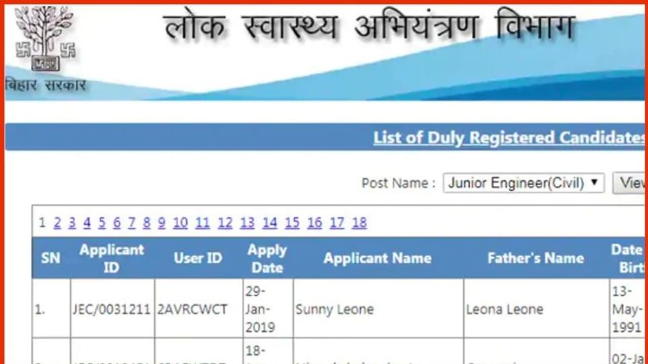 സണ്ണി ലിയോണിന്റെ ആപ്ലിക്കേഷന് ഐഡി ജെഇസി/00311211 എന്ന നമ്പറിലായിരുന്നു. യൂസര് ഐഡി 2എവിആര്സിഡബ്യൂസിടി എന്നാണ്. ബിഹാറിലെ ഒഴിവുവന്ന 214 ജൂനിയര് എന്ജിനീയര് (സിവില്) പോസ്റ്റിലേക്ക് ജനുവരി 15 മുതല് 31 വരെയാണ് പരീക്ഷ പനടത്തിയത്. പരീക്ഷാഫലം വെബ്സൈറ്റില് പ്രസിദ്ധീകരിച്ചതിന് പിന്നാലെയാണ് സണ്ണിയുടെ വാര്ത്ത ദേശീയ മാധ്യമങ്ങളില് വാര്ത്തയായത്.