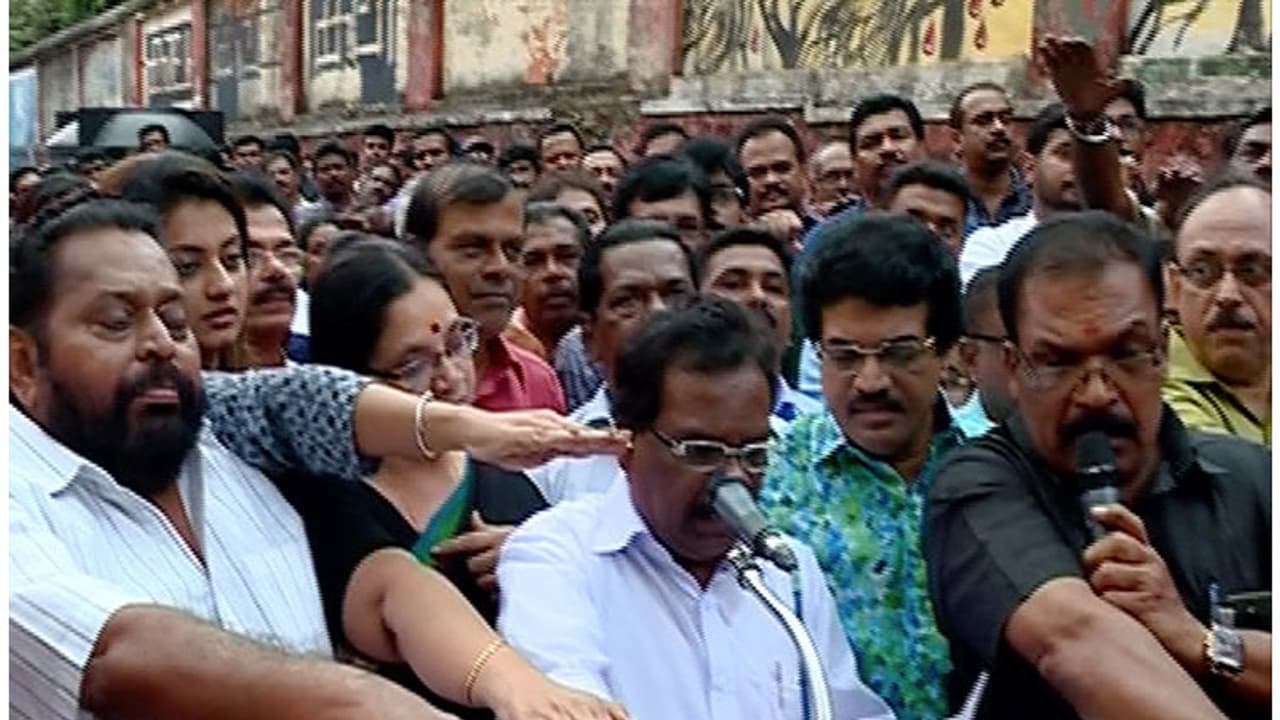 തിരവനന്തപുരം മാനവീയം വീഥിയില് സംഘടിപ്പിച്ച പ്രതിഷേധ കൂട്ടായ്മയില് സിനിമാ സീരിയല് രംഗത്തെ പ്രമുഖര്ക്കൊപ്പം രാഷ്ട്രീയ സാംസ്കാരിക പ്രവര്ത്തകരും അണിനിരന്നു.