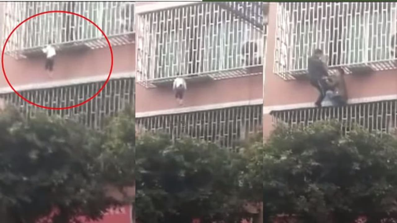 മൂന്നാം നിലയിലെ അപ്പാർട്ട്മെന്റിൽനിന്നാണ് പെൺകുട്ടി കാൽ വഴുതി വീണത്. വീഴ്ച്ചയിൽ കുട്ടിയുടെ കഴുത്ത് അഴിക്കുള്ളിൽ കുടുങ്ങുകയായിരുന്നു. ബാൽക്കണിയിൽനിന്ന് തൂങ്ങിയാടുന്നതുകണ്ട പെൺകുട്ടിയെ രണ്ട് യുവാക്കൾ ചേർന്ന് രക്ഷിക്കുന്നതും വീഡിയോയിൽ കാണാം.