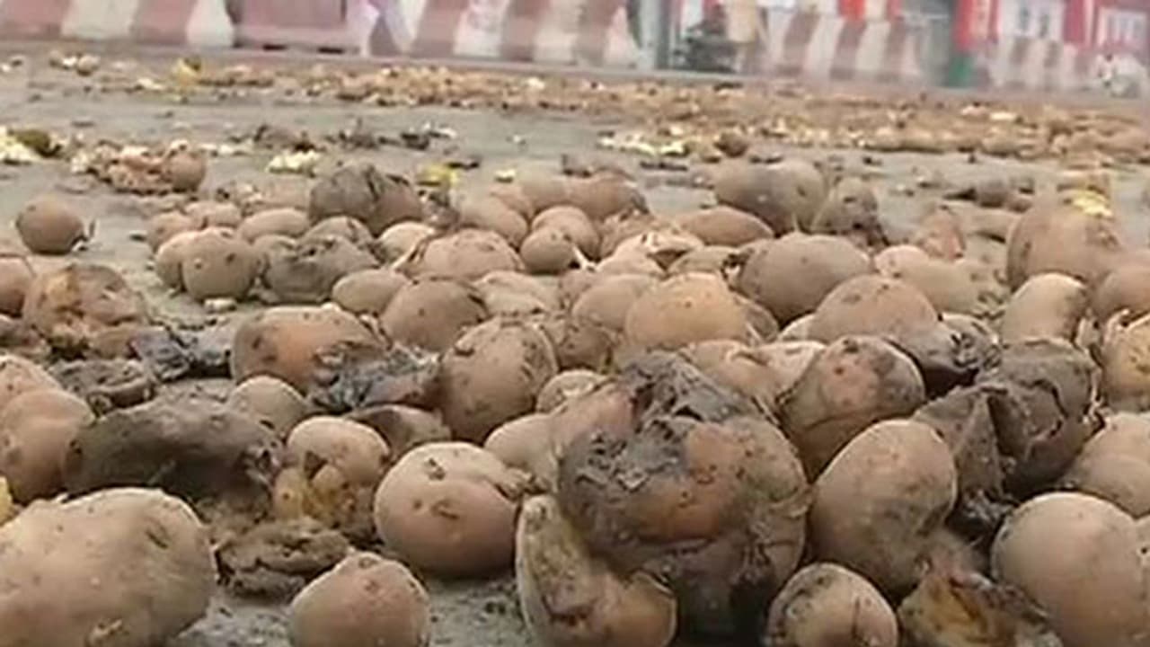 ഒരു ക്വിന്റല് ഉരുളക്കിഴങ്ങിന് മൂന്ന് മുതല് നാല് രൂപ വരെ മാത്രമാണ് ലഭിക്കുന്നതെന്നും എന്നാല് 10 രൂപയെങ്കിലും കിട്ടണമെന്ന് ആവശ്യപ്പെട്ടായിരുന്നു കര്ഷകരുടെ പ്രതിഷേധം. ട്രക്കില് കൊണ്ടുവന്ന് ഉരുളക്കിഴങ്ങ് തട്ടുകയായിരുന്നു. എന്നാല് അതീവ സുരക്ഷാ മേഖലയില് ഉരുളക്കിഴങ്ങ് കൊണ്ടിടാന് കാരണമായതിന് സുരക്ഷാചുമതലയുണ്ടായിരുന്ന അഞ്ച് പൊലീസുകാരെ സസ്പെന്റ് ചെയ്തിട്ടുണ്ട്. നാല് കോണ്സ്റ്റബിള്മാര്ക്കും ഒരു സബ് ഇന്സ്പെക്ടര്ക്കുമെതിരെയാണ് നടപടി.