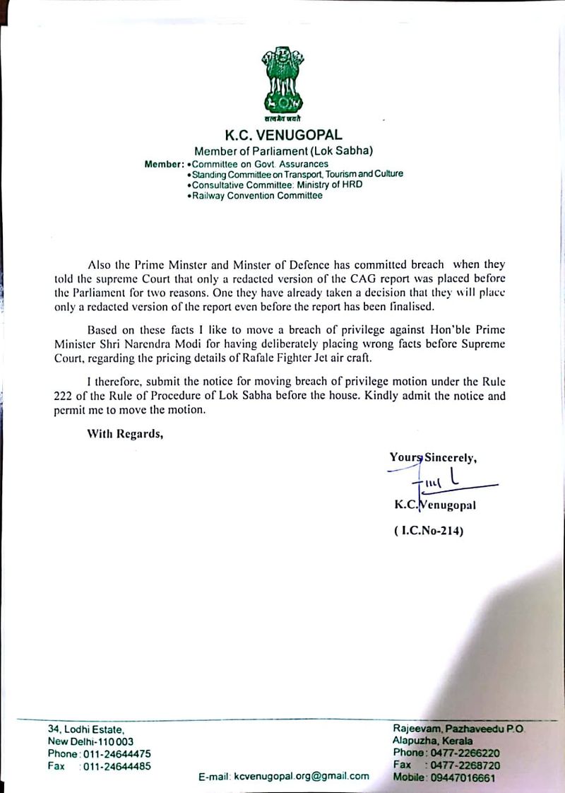 രാവിലെ റഫാൽ ഇടപാടിനെച്ചൊല്ലി കോൺഗ്രസ് ലോക്സഭയിൽ പ്രധാനമന്ത്രിയ്ക്കെതിരെ അവകാശലംഘനനോട്ടീസ് നൽകി. എംപി കെ സി വേണുഗോപാലാണ് അവകാശലംഘനനോട്ടീസ് നൽകിയത്. ഇല്ലാത്ത സിഎജി റിപ്പോർട്ട് ഉണ്ടെന്ന് കോടതിയിൽ പറഞ്ഞു, സിഎജി റിപ്പോർട്ട് പൂർണമായും സഭയിൽ വയ്ക്കില്ലെന്ന് സുപ്രീംകോടതിയിൽ നൽകിയ സത്യവാങ്മൂലത്തിൽ എഴുതി എന്നീ കാര്യങ്ങൾ ചൂണ്ടിക്കാട്ടിയാണ് കോൺഗ്രസ് ഇരുസഭകളിലും പ്രധാനമന്ത്രിയ്ക്കെതിരെ അവകാശലംഘനത്തിന് നോട്ടീസ് നൽകിയത്. അറ്റോർണി ജനറൽ കെ കെ വേണുഗോപാലിനെതിരെ സിപിഎമ്മും നോട്ടീസ് നൽകി.
