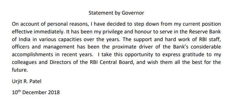 റിസർവ് ബാങ്ക് ഗവർണർ ഊർജിത് പട്ടേൽ സ്ഥാനം രാജിവച്ചു.നാളെ അഞ്ച് സംസ്ഥാനങ്ങളുടെ തെരഞ്ഞെടുപ്പ് ഫലം വരാനിരിക്കെയാണ് ഊർജിത് പട്ടേലിന്റെ രാജി. ആർബിഐയുടെ സ്വതന്ത്രാധികാരത്തിൽ ഇടപെട്ടതിനെത്തുടർന്ന് നേരത്തേ തന്നെ ഊർജിത് പട്ടേലും അരുൺ ജയ്റ്റ്ലിയും തമ്മിൽ ഭിന്നത രൂക്ഷമായിരുന്നു.