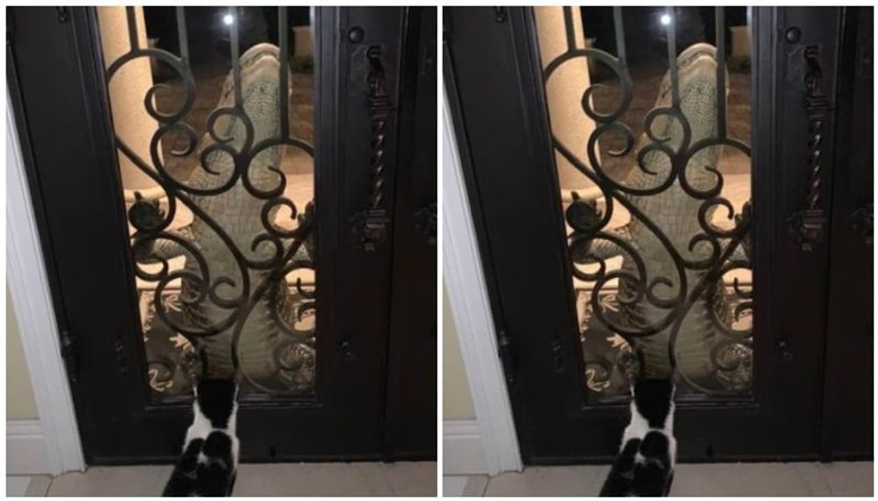 ഫ്ലോറിഡയിലെ സരസോട്ടയിലെ ഒരു വീട്ടിലാണ് ചീങ്കണ്ണിയെത്തിയത്. വാതില്ക്കലെത്തിയ ചീങ്കണ്ണിയെ കണ്ട് ഭയന്ന് വീട്ടുകാര് സുരക്ഷിത സ്ഥാനത്തേക്ക് മാറുമ്പോഴാണ് കല്ലുപോലെ ഉറച്ച് നില്ക്കുന്ന പൂച്ചയെ ശ്രദ്ധിക്കുന്നത്. വീട്ടുകാര് പിന്തിരിയാന് ആവശ്യപ്പെട്ടിട്ടും കൂട്ടാക്കാതെ വാതിലിന് സമീപം ചീങ്കണ്ണിയുടെ തൊട്ടടുത്താണ് പൂച്ച നിന്നത്. വാതില് തുറക്കാന് ശ്രമിക്കുന്നത് പോലുള്ളശബ്ദം കേട്ടാണ് മുന് വാതിലില് വീട്ടുകാര് ചെന്ന് നോക്കിയത്. വീട്ടുകാര്ക്കൊപ്പം പൂച്ചയുമുണ്ടായിരുന്നു.
