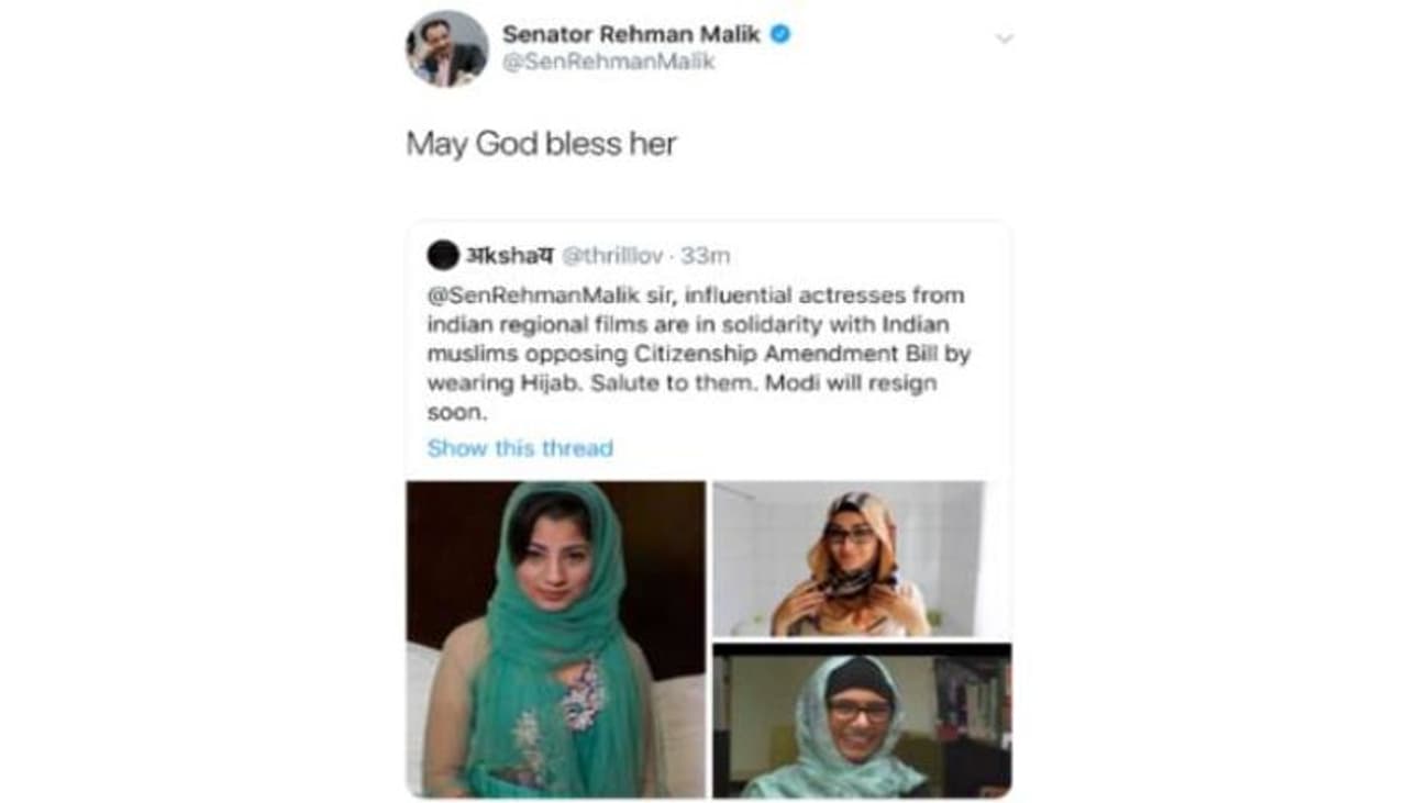 പൗരത്വനിയമ ഭേദഗതിയ്ക്കെതിരെ ഹിജാബ് ധരിച്ച് പ്രതിഷേധിക്കുന്ന പ്രാദേശിക നടിമാര് എന്ന പേരിലാണ് മിയ ഖലീഫ അടക്കമുള്ള മൂന്ന് പോണ് താരങ്ങളുടെ ചിത്രം റഹ്മാന് മാലികിനെ ടാഗ് ചെയ്ത് ട്വീറ്റ് ചെയ്തിരിക്കുന്നത്. ഈ ട്വീറ്റാണ് മാലിക് റീട്വീറ്റ് ചെയ്തത്. മോദി ഉടന് രാജിവയ്ക്കുമെന്നും ആ ട്വീറ്റില് കുറിച്ചിട്ടുണ്ട്.