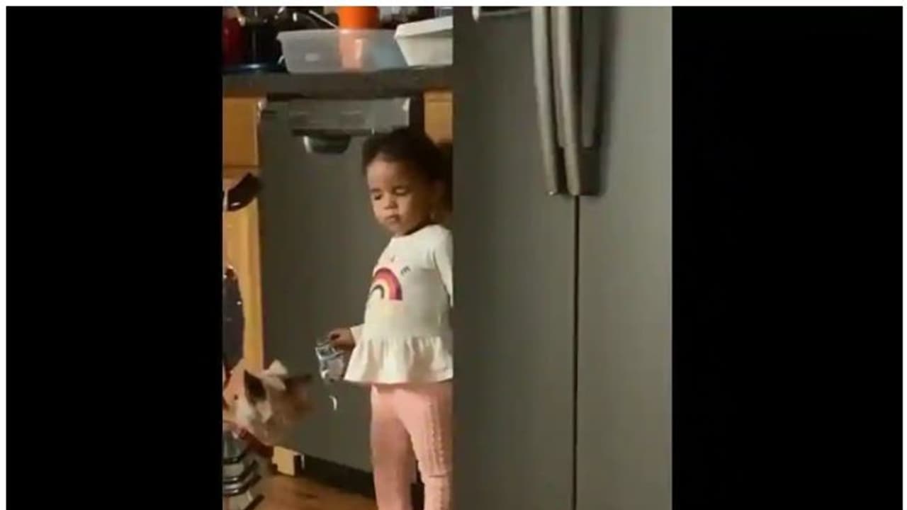 ക്രിസ് ജെ വോണ് എന്ന യുവതിയാണ് മകളുടെ കുസൃതി ഫോണില് ചിത്രീകരിച്ച് ഫേസ്ബുക്കില് പോസ്റ്റ് ചെയ്തത്. പിന്നീട് ട്വിറ്ററിലും ഇന്സ്റ്റഗ്രാമിലും വീഡിയോ വൈറലായി. ഏകദേശം രണ്ട് വയസ്സ് തോന്നിക്കുന്ന കുട്ടി അടുക്കളയില് ഫ്രിഡ്ജില് നിന്ന് ആരും കാണാതെ സ്നാക്ക്സ് എടുത്തുകൊണ്ടുവരികയാണ്. പെട്ടെന്നാണ് അമ്മയുടെ ശബ്ദം. അതോടെ കുട്ടി നിന്ന നില്പ്പില് ഉറങ്ങിപ്പോകുന്നു. എന്താണ് കൈയില്, എടുത്ത് തിരിച്ച് വെക്ക്, കണ്ണ് തുറക്ക് എന്നൊക്കെ പറയുന്നുണ്ട്. അവള് കേട്ട മട്ടേയില്ല. അവസാനം നീ ഉറക്കമാണോ എന്ന് ചോദിക്കുമ്പോള് പതിയെ കണ്ണ് തുറന്ന് കള്ളചിരി ചിരിക്കുന്നു. ഇതിനെല്ലാം സാക്ഷിയായി സമീപത്ത് ഒരു നായ്ക്കുട്ടിയുമുണ്ട. ആരിലും ചിരിയുണര്ത്തുന്നതാണ് കുട്ടിയുടെ ഭാവങ്ങള്.